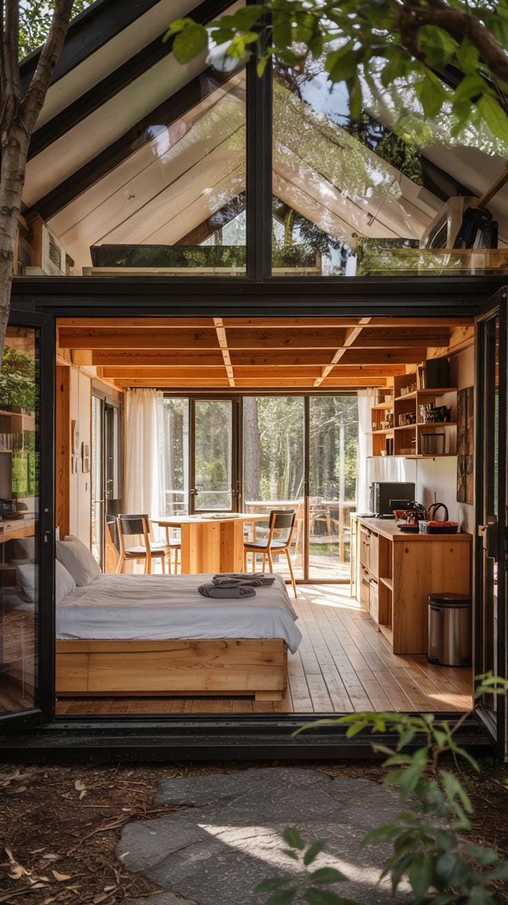 The framing uses heavy timber or engineered wood, providing excellent strength and stability. Inside, the open design means fewer interior walls, which saves materials and keeps the space flexible.
