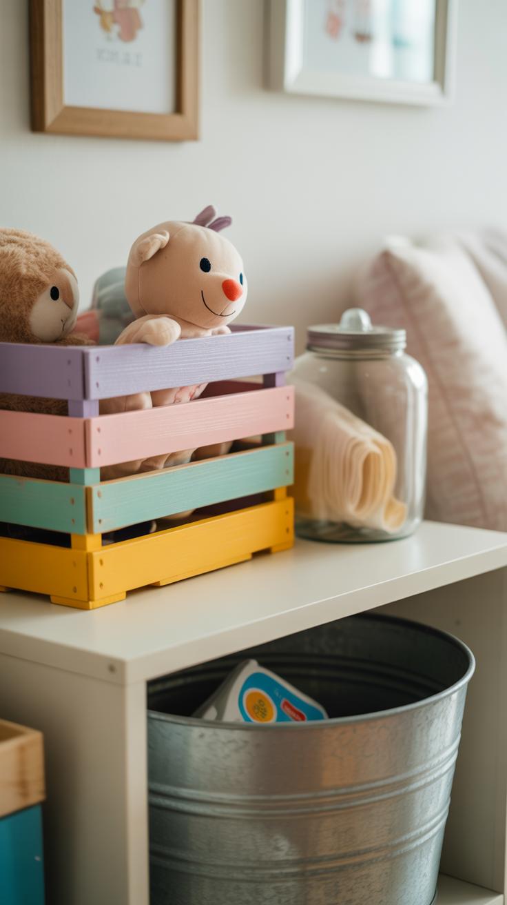 Think about using woven baskets for diapers—they’re breathable, which helps keep things fresh. Plus, they slide easily onto shelves or under changing tables. Wooden crates add a rustic touch and can be stacked or fixed to walls for extra storage. Placed sideways, they turn into little cubbies perfect for folded clothes or soft toys. I once lined a crate with a thin cloth to make a soft bin for plush animals—simple but effective. You might hesitate because crates seem rough, but sanding and a light coat of paint can make them nursery-ready. The best part? You get storage and a bit of design in one.