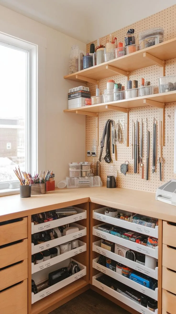 Small bins and clear containers help you see what’s inside without digging through piles. Label everything to speed up finding what you need. Use wall space wisely by installing pegboards or hooks to hang tools vertically. This keeps surfaces clean and gives every item a dedicated spot.