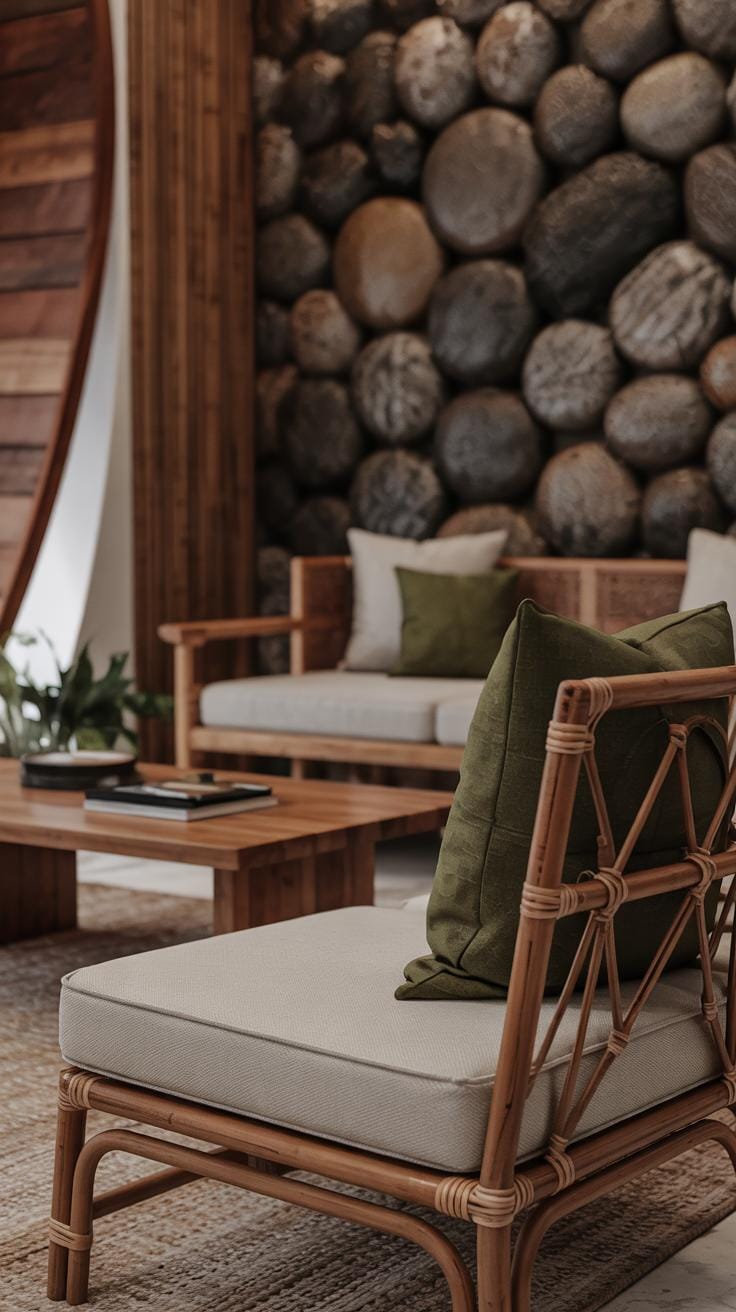 Think about mixing textures such as rough stone floors with polished wood tables or woven rattan chairs. This contrast keeps your interior interesting and inviting. Look at the color tones in your materials and balances darker woods with light bamboo or stone to avoid heaviness.