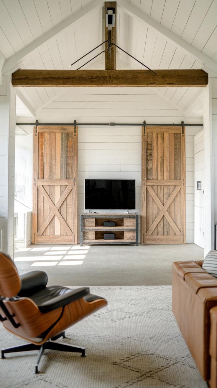 Do you want a TV in your living room? Mount it on a sliding barn door or frame it with reclaimed wood to keep the rustic feel. Clever placement and design choices let technology live quietly alongside your décor.