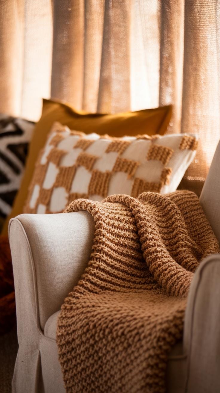 Pick cushions in natural fabrics like wool, linen, or cotton to keep them comfortable and durable. Look for faded colors or muted patterns such as checks or stripes to maintain the rustic theme. Throws in earthy tones or soft textures invite you to relax and unwind.