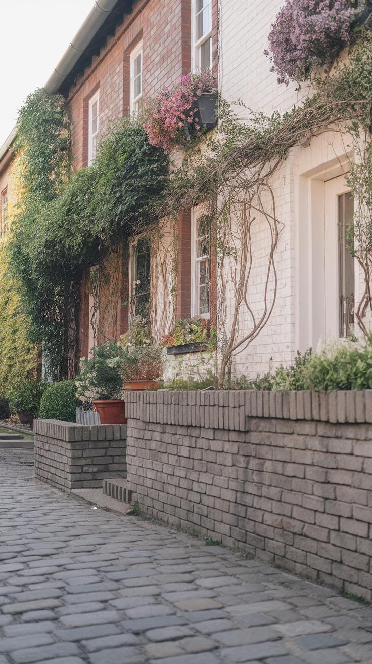 Plants close to brick walls should have colors that either pop against or softly complement the brick. For red bricks, green plants with light flowers like white or soft pink work well. For tan or beige bricks, brighter flowers such as lavender or bluebells offer great contrast. Position climbing plants like ivy or clematis along walls, but keep them trimmed to avoid damage.