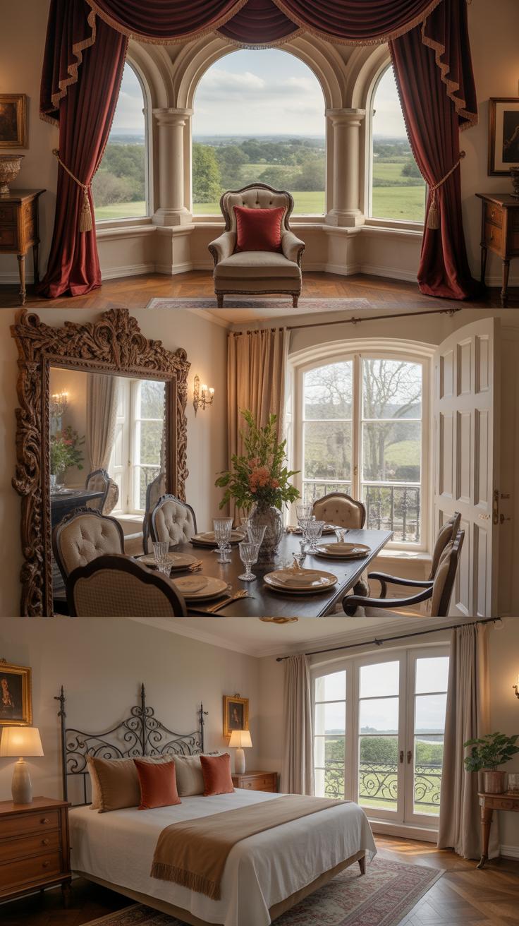 Ornate mirrors and tapestries can add drama to walls, but don’t overdo it. I’ve found that focusing on one or two statement pieces works better than cluttering every inch. Simple window treatments in rich colors can frame your space without distracting from the main features.