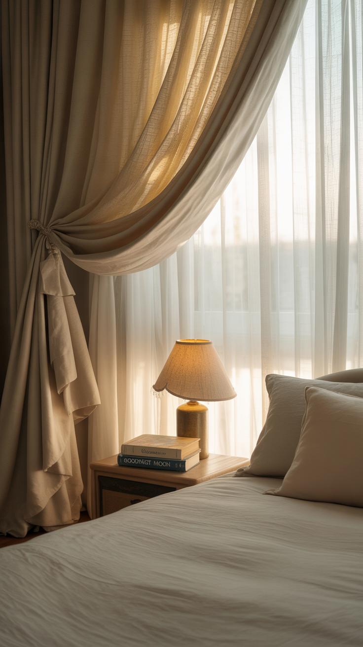 • Sheer curtains soften sunlight, creating a gentle glow without losing privacy.