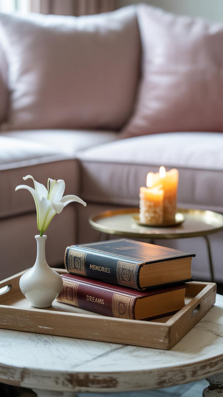 Once you have your tray, arrange items so they look coordinated but not too forced. Mix heights and shapes: a candle, a small vase, a stack of books, or even a simple decorative object. Leave some empty space—don’t cram it completely; that’s how things go from neat to cluttered.