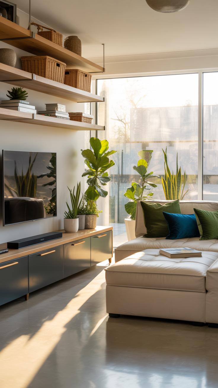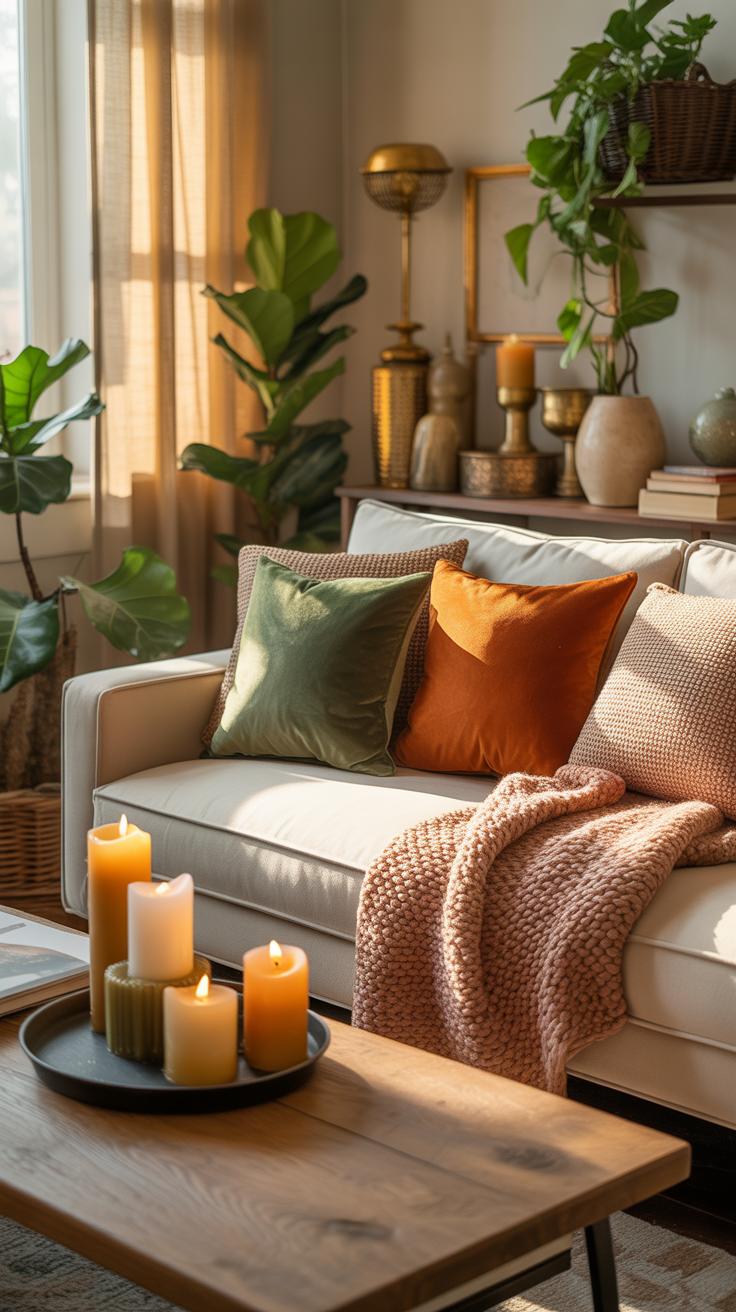 - A beige or light gray sofa accented with mustard or terracotta cushions adds just enough warmth without overwhelming the space.