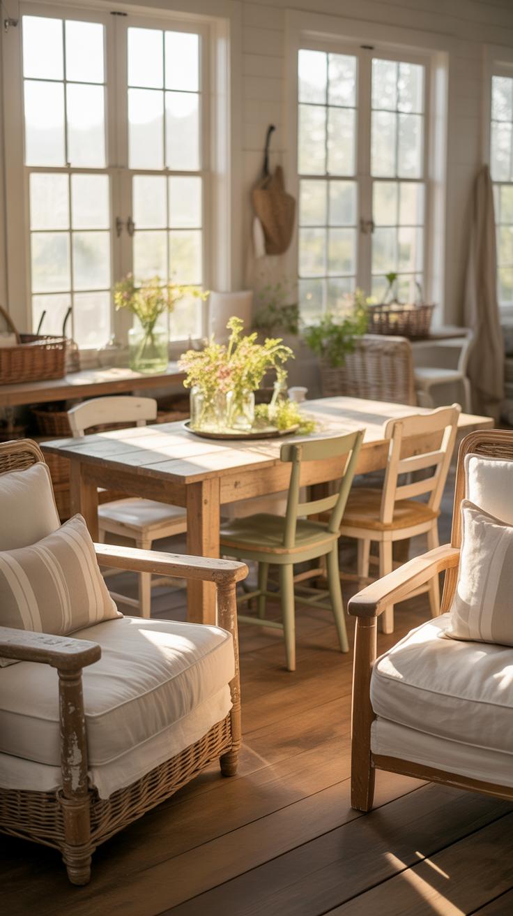 Furniture plays a big role here, too. Mixing sleek modern pieces with rustic farmhouse tables might create tension rather than harmony. Try to select furnishings that share a similar vibe — distressed woods or painted finishes with aged charm work best.