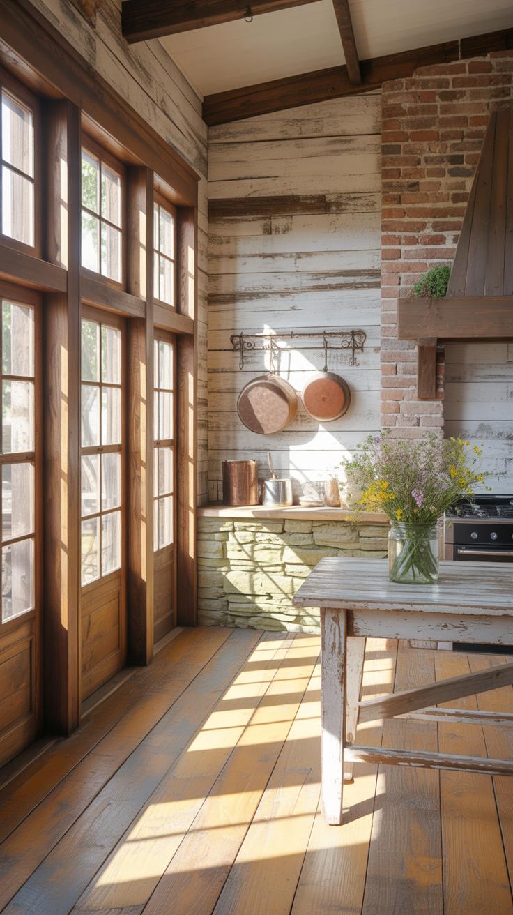 Stone and brick have a special place in farmhouse decor, often used on floors and walls. Stone floors suit high-traffic areas because they’re tough and cool, perfect if you prefer a natural, rugged look. Materials like slate or flagstone are common; they add texture and depth but do require sealing to prevent stains.