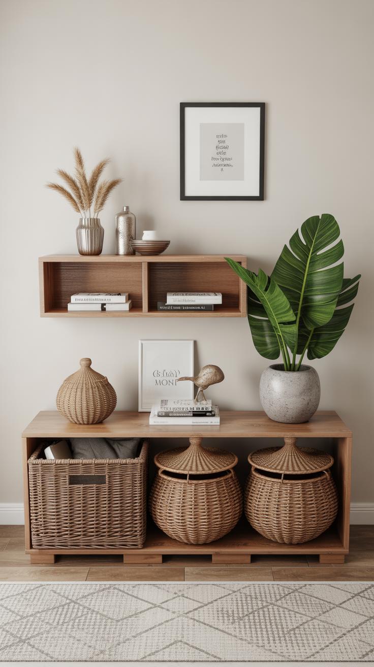 Woven baskets are another staple. They serve a purpose but also introduce a rustic, handmade vibe that perfectly fits boho. Fill them with extra blankets, magazines, or even more plants. Would you try a combination of these elements on a shelf, mixing wood, stone, and greenery? It’s a quiet way to let nature coexist with your everyday life and keeps the room grounded in something real.
