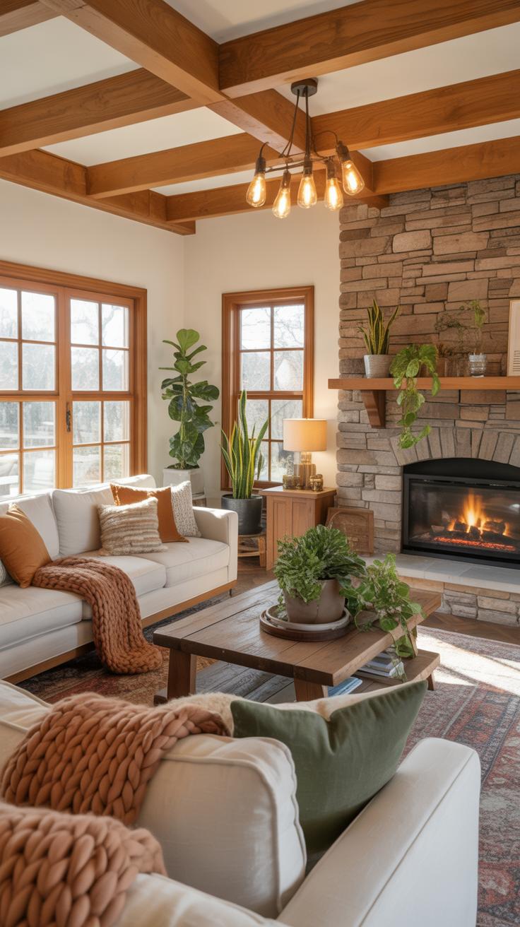 Cushions, throws, and rugs made from natural fibers are absolute musts in cozy farmhouse living rooms. They don’t just provide softness—they add layers of texture that make a room feel lived-in and inviting. A chunky cotton throw casually tossed over a sofa can transform the mood instantly.
