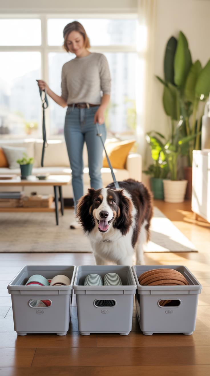 Size does matter when choosing storage, not just the size of your dog’s stuff, but your home’s space too. In a small apartment, for instance, you might prefer wall-mounted racks or stackable boxes that don’t take up floor space. Meanwhile, a larger home with a dedicated mudroom or entryway might allow for bigger storage like closed cabinets or benches with built-in compartments.