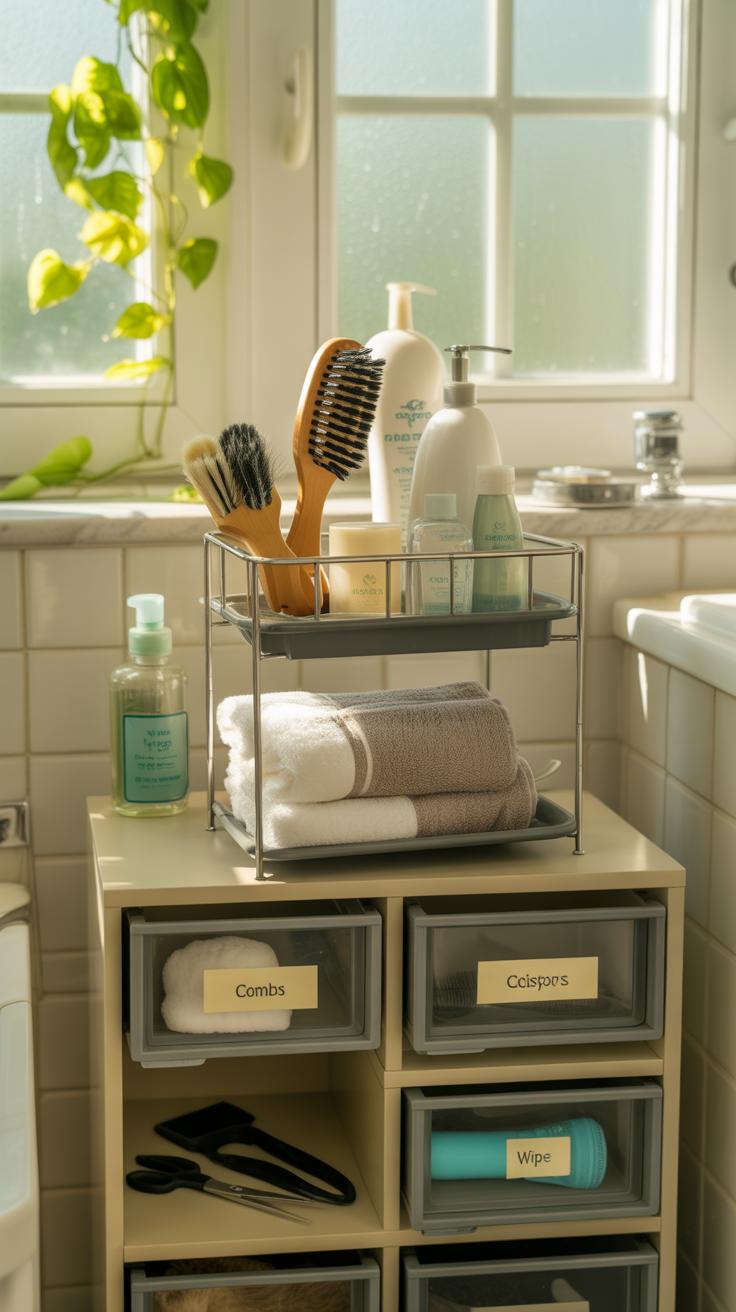 - Grooming Items: Smaller containers or trays help keep brushes, shampoos, and nail clippers organized.