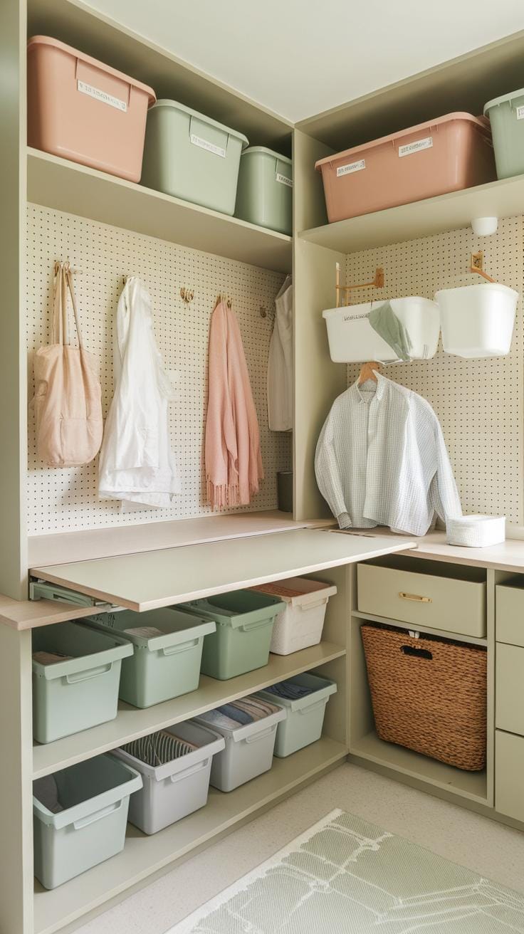 Sorting bins near your folding area make laundry organization easier. Label bins by color, fabric type, or family member to keep clothes separated and ready for washing. This setup lightens the load when laundry day arrives.