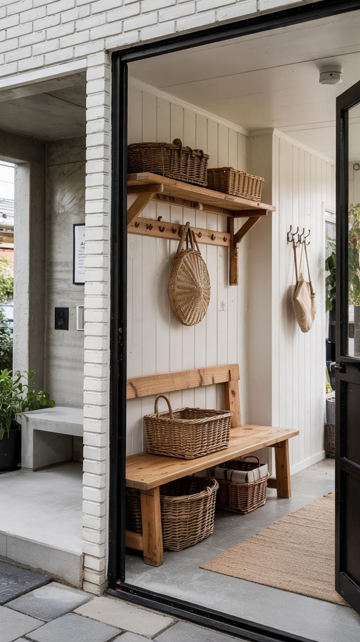 Start with a bench or a small seating option. A narrow bench that fits your entry’s width works well for putting on shoes. Look for benches with built-in storage or under-seat baskets for added function without extra clutter.