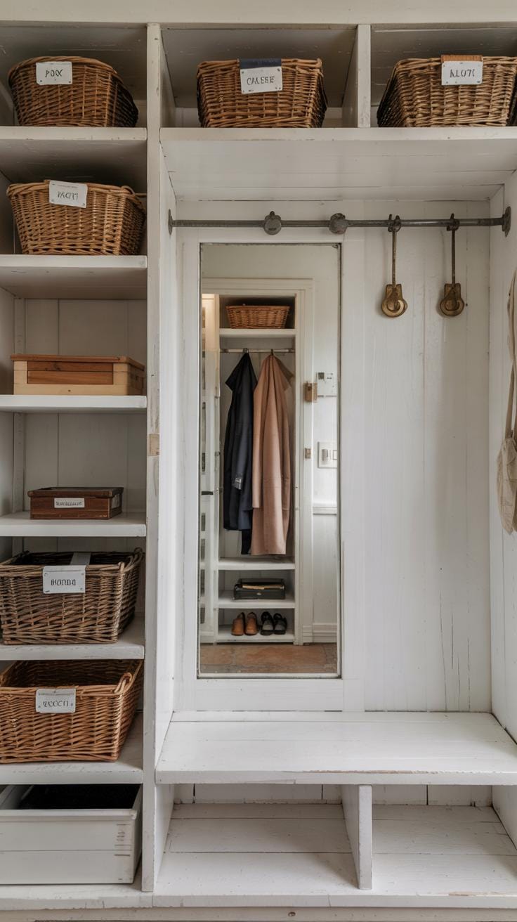 A slim bench with hidden compartments offers seating and storage at once. You can store shoes or seasonal items inside, keeping the entry free of clutter. Shelves that float on the wall add storage without bulk.
