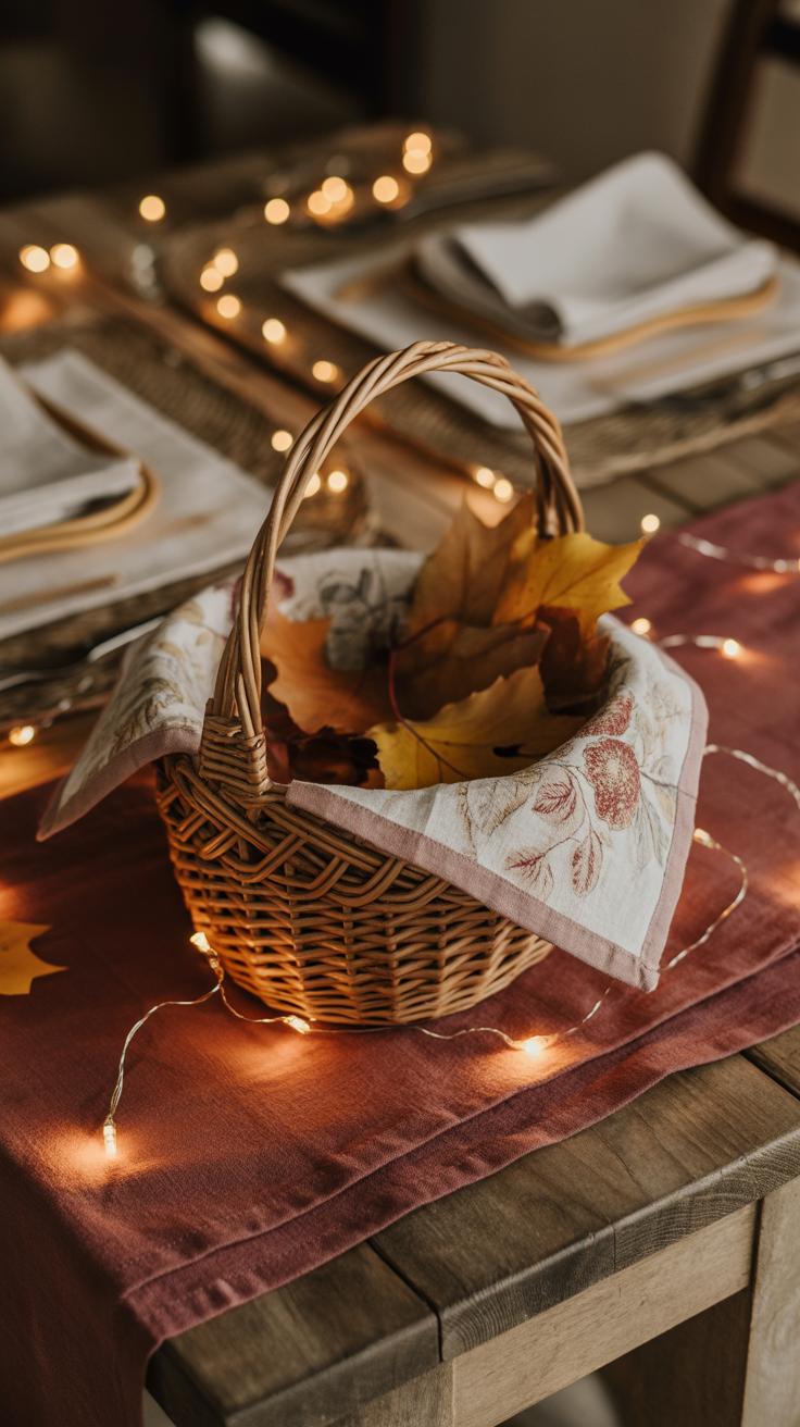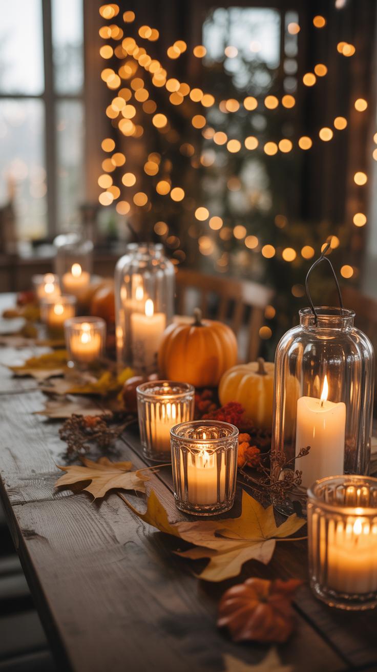 String lights aren’t just for outside or holidays. Draped subtly along the centerpiece or around a window near your table, they add a gentle, cozy light that’s easier on the eyes than overhead lamps. Warm white or soft yellow bulbs fit the fall feel best. You could also scatter small, battery-operated fairy lights inside clear jars among other decorations.