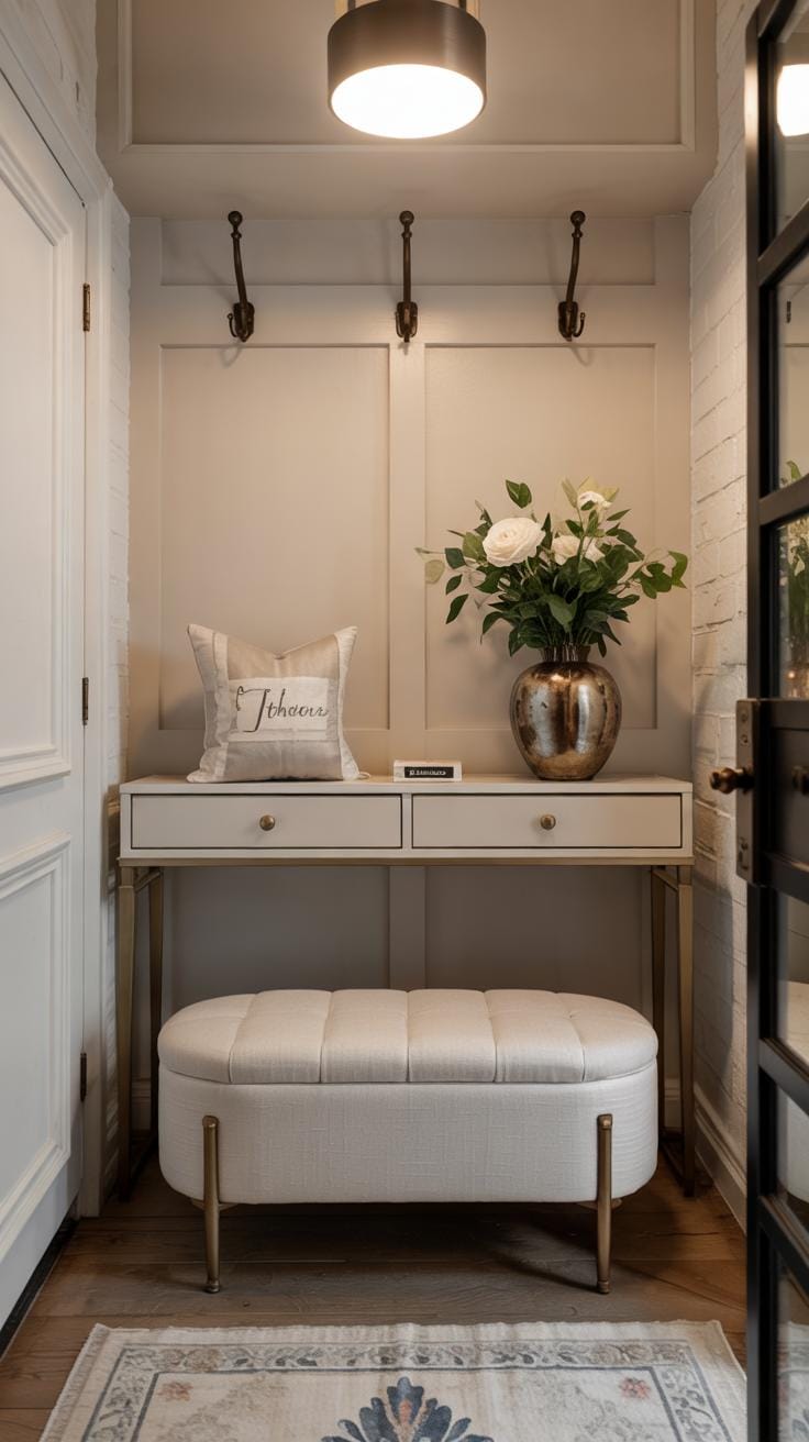 Soft textiles like rugs protect floors and add texture. A runner or small area rug creates a cozy feel underfoot and defines the space. Cushions on a bench offer comfort while inviting guests to pause. Select patterns and colors that complement your style but keep them simple enough to avoid visual clutter.
