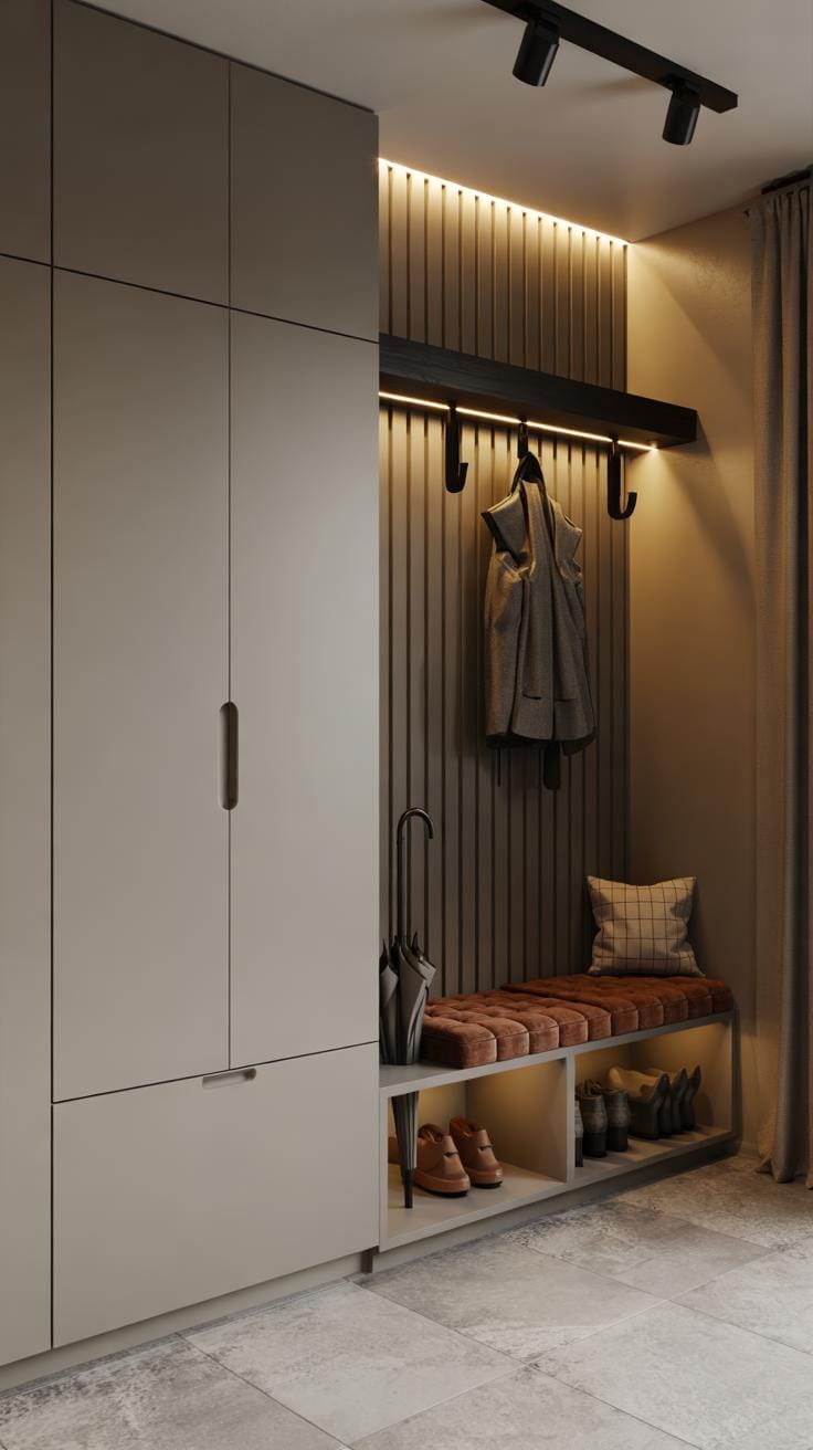 Hooks mounted near the door provide a place to hang coats, bags, and hats instantly. Use cubbies or small shelves for shoes and mail to avoid piles on the floor or counters. Hidden storage behind doors or under benches conceals items without limiting access.