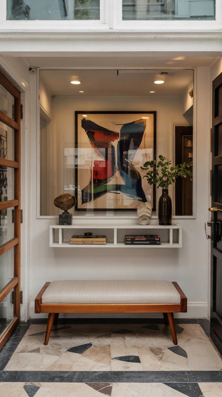 Compact furniture suits small foyers best. Wall-mounted shelves hold small items and decorative accents without taking floor space. Narrow benches offer a place to sit and can double as shoe storage underneath.