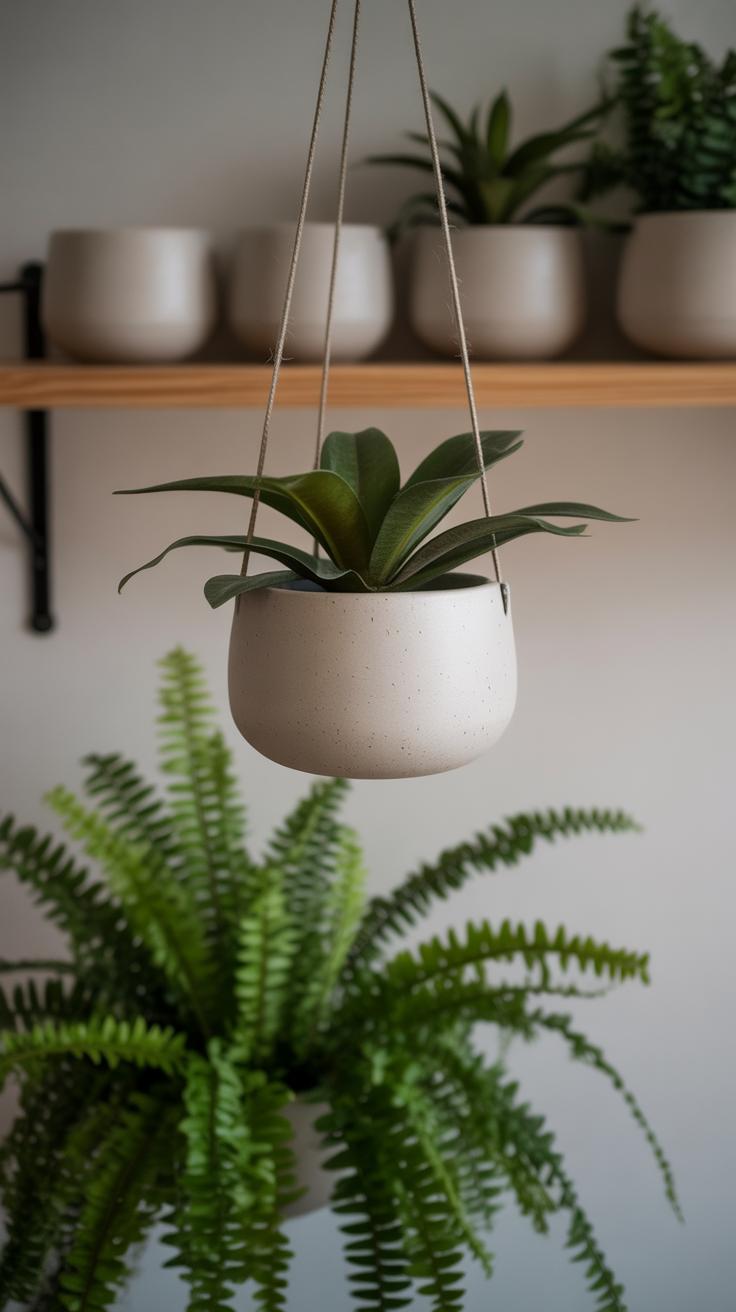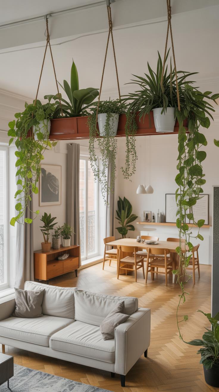 Think about your living and dining areas. A cluster of trailing vines or a single statement planter hanging at eye level can suggest separation without shouting. It’s more subtle than a bookshelf or a screen but just as effective.