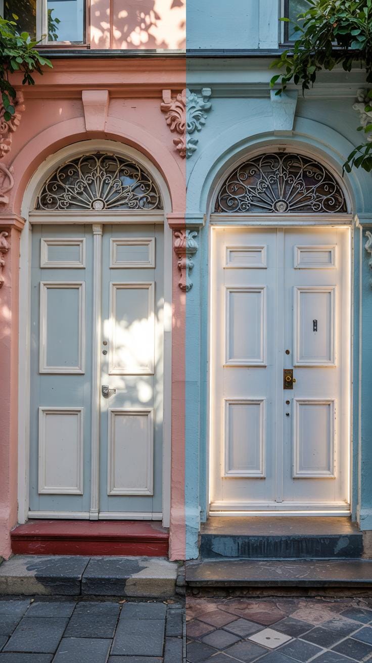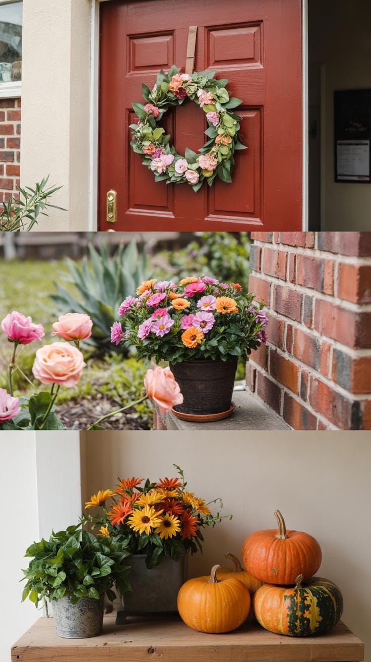 Incorporate wreaths made of seasonal materials like berries, leaves, or pine. Lanterns with candles or solar lights provide warmth during darker months. Grouped planters with seasonal flowers or grasses add dimension. Changing the doormat to reflect the season’s palette or theme also creates an inviting detail without crowding your entrance.