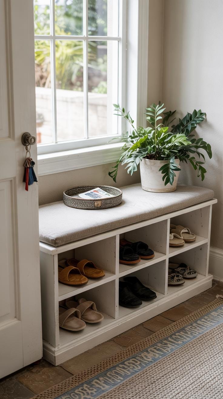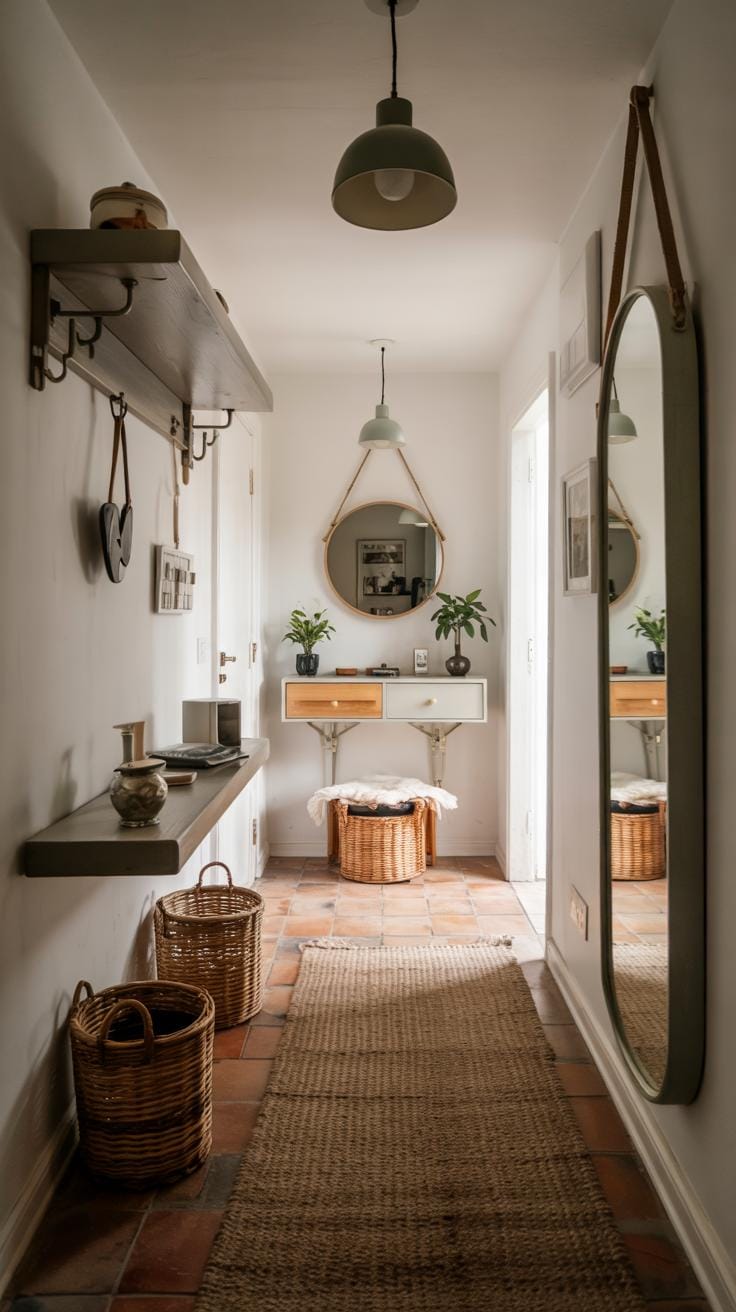 Compact furniture makes a big difference in a small entryway. Narrow benches with built-in storage let you sit and stash away shoes or bags. Floating shelves mounted on the wall take up no floor space but hold keys and mail.