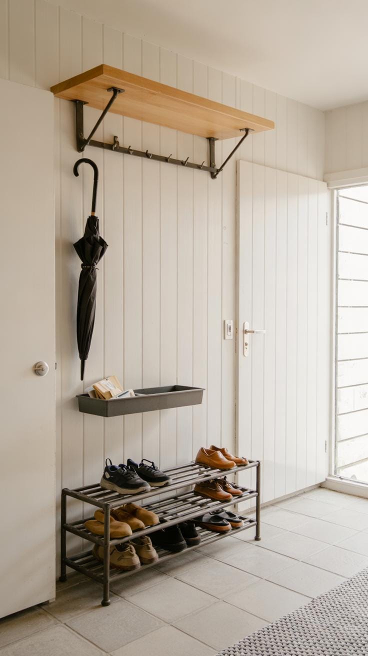 Shoe racks keep footwear organized and off the floor. A simple wooden or metal rack fits many spaces and helps maintain tidiness. Coat hooks or wall-mounted racks provide spots to hang jackets and bags without crowding the floor.