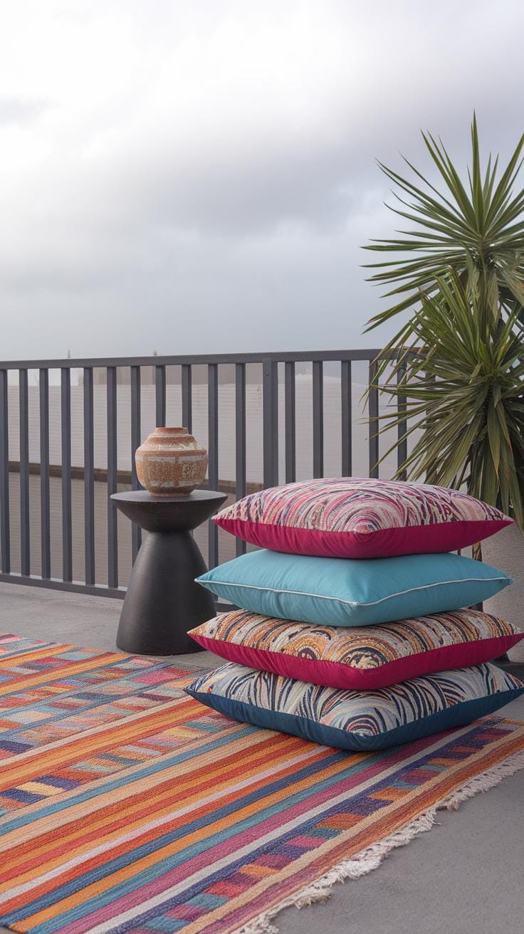 Textiles bring warmth and color, making your balcony feel like an extension of your home. Choose cushions made from outdoor-grade fabrics that resist fading and mildew. Add a small outdoor rug to define seating areas and provide a soft surface underfoot. Throws designed for outdoor use help you stay comfortable during cooler evenings and add texture. Bright patterns or solid colors can lift the mood, but keep scale and quantity manageable. Pair a couple of cushions with a matching rug rather than piling on multiple pieces. Consider materials like solution-dyed acrylic or polyester that hold up against sun and rain. Would your balcony feel cozier with a splash of color beneath your chair or a patterned cushion on your bench?