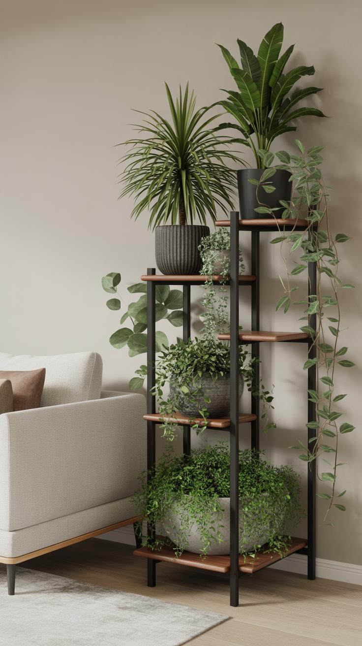 Using shelves or stands is almost like building a mini jungle indoors. Varied heights break visual monotony and add depth. Imagine a low stool with a trailing plant beside a tall stand holding a spiky palm. This layered approach encourages your gaze to wander around the room—and plants look happier when they aren’t crowded on one flat surface.