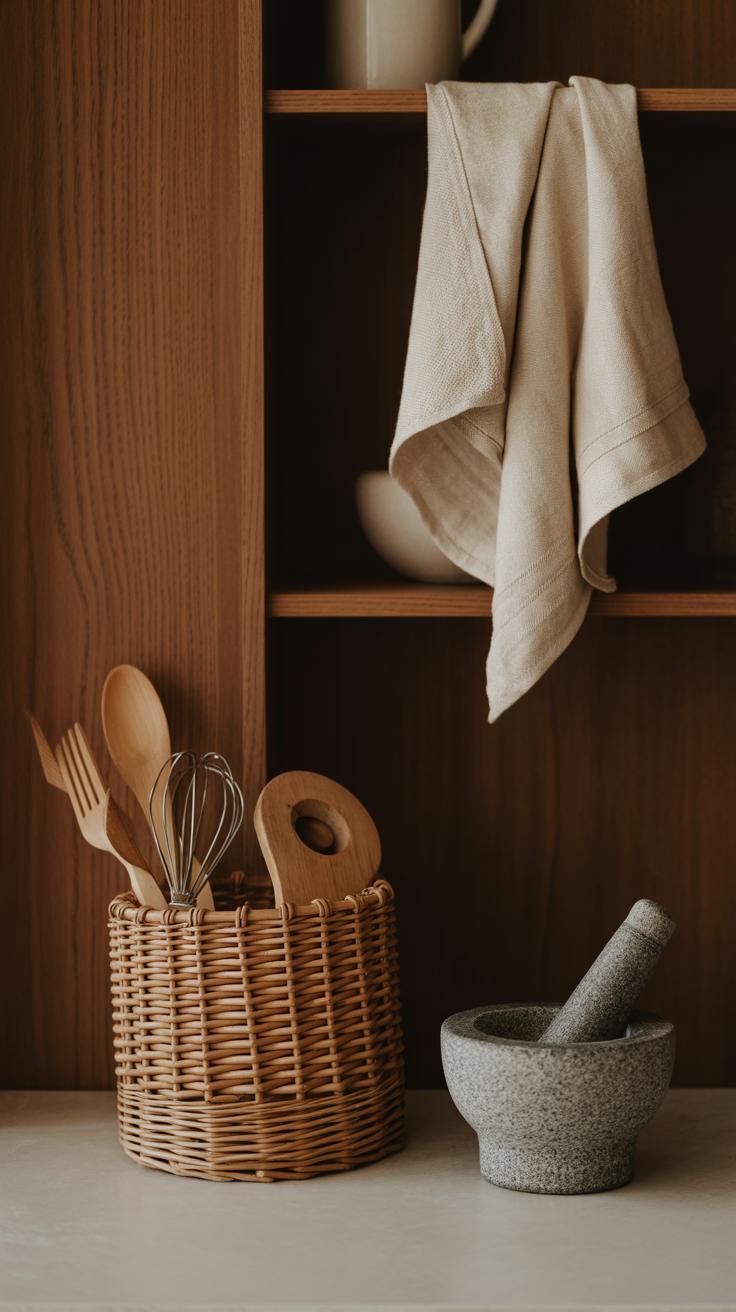 Textiles can add warmth in a subtle way. Linen towels with soft natural tones or gently worn rugs soften the space and invite comfort. While you might think a few textured pieces could crowd the minimalist look, they usually deepen it if chosen carefully. I’ve found that using textiles lets you play around a bit—sometimes switching colors or fabrics with the seasons. It’s a quiet way to personalize without clutter. And those small, thoughtful details, like simple wooden spoons or minimalist utensil holders, quietly pull everything together.