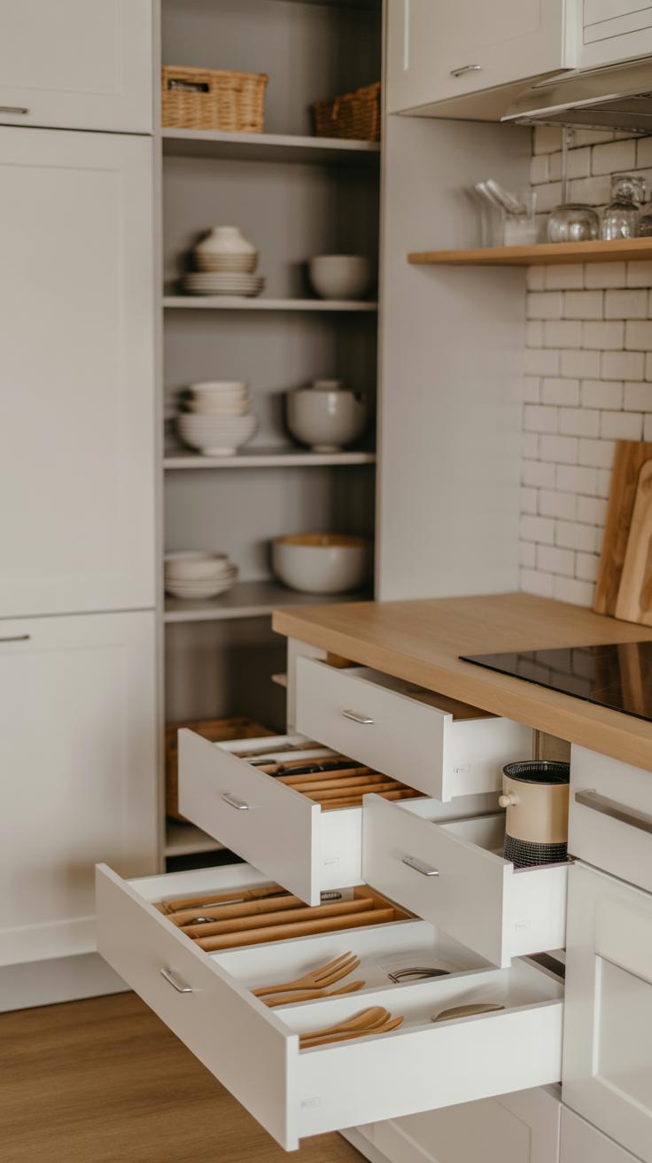 Also, pay attention to your utensils and tools. Storing them neatly in bamboo or wooden holders matches Japandi’s natural aesthetic, but it also keeps things organized, making cleaning easier. Don’t forget about air circulation—opening windows or using exhaust fans helps reduce lingering smells and moisture that could disrupt this calm environment.