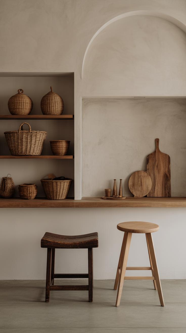 Simple ceramics and natural fabrics balance this woodiness. Think smooth, handcrafted bowls or matte-finished mugs that don’t try to be showy but look unfinished in an intentional way. Linen or cotton tea towels, cushions, maybe even a runner, contribute texture without clutter. These fabrics often have a slightly rough weave or wrinkled look, which stops the kitchen from feeling too clinical or sparse. Including these materials isn’t just about looks—they add a sensory layer that invites touch and use, blending utility with calm aesthetics.