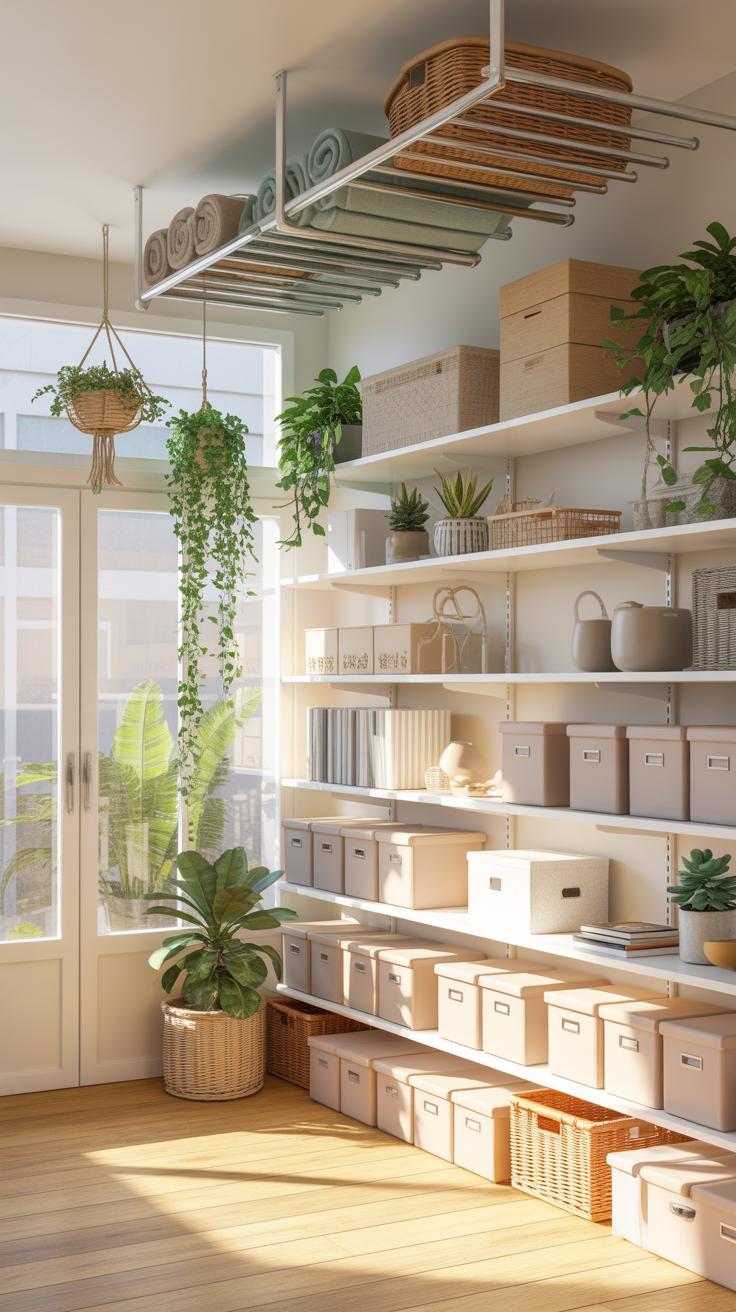 Looking overhead, ceiling-mounted racks and hooks can be game changers. These are not just for garages or basements. Think: hanging racks for plants, overhead pot racks adapted for a living room’s aesthetics, or hooks for lightweight baskets. It might sound unusual at first, but it helped me clear my small living room floor of bulky storage bins.