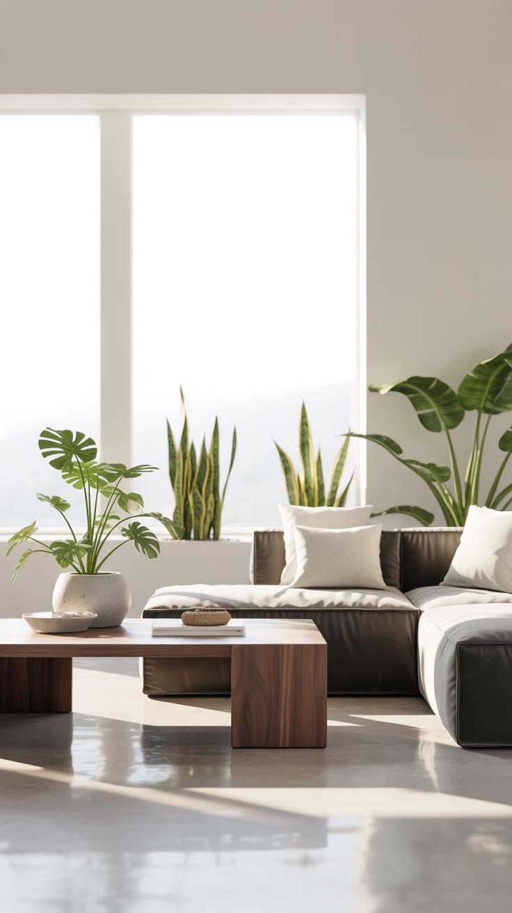Another example is a suburban living room where the minimalist approach balances comfort and clarity. The space combines soft textiles and natural light with streamlined furniture. A few plants soften the sharp edges and add color without cluttering the design. The sense is calm, but far from sterile.