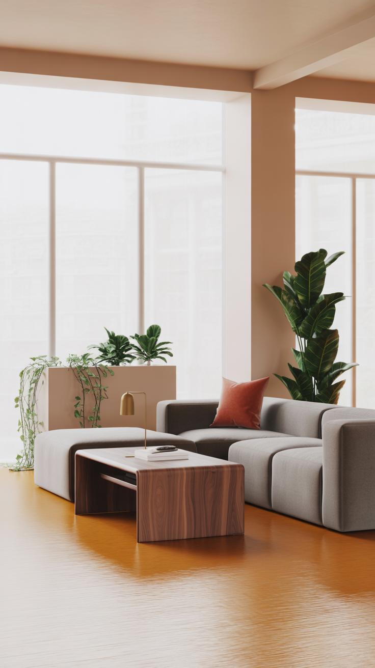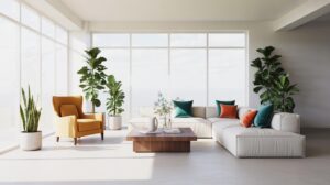 - A sofa or seating area with clean lines—nothing too fussy, but not so austere that it feels cold