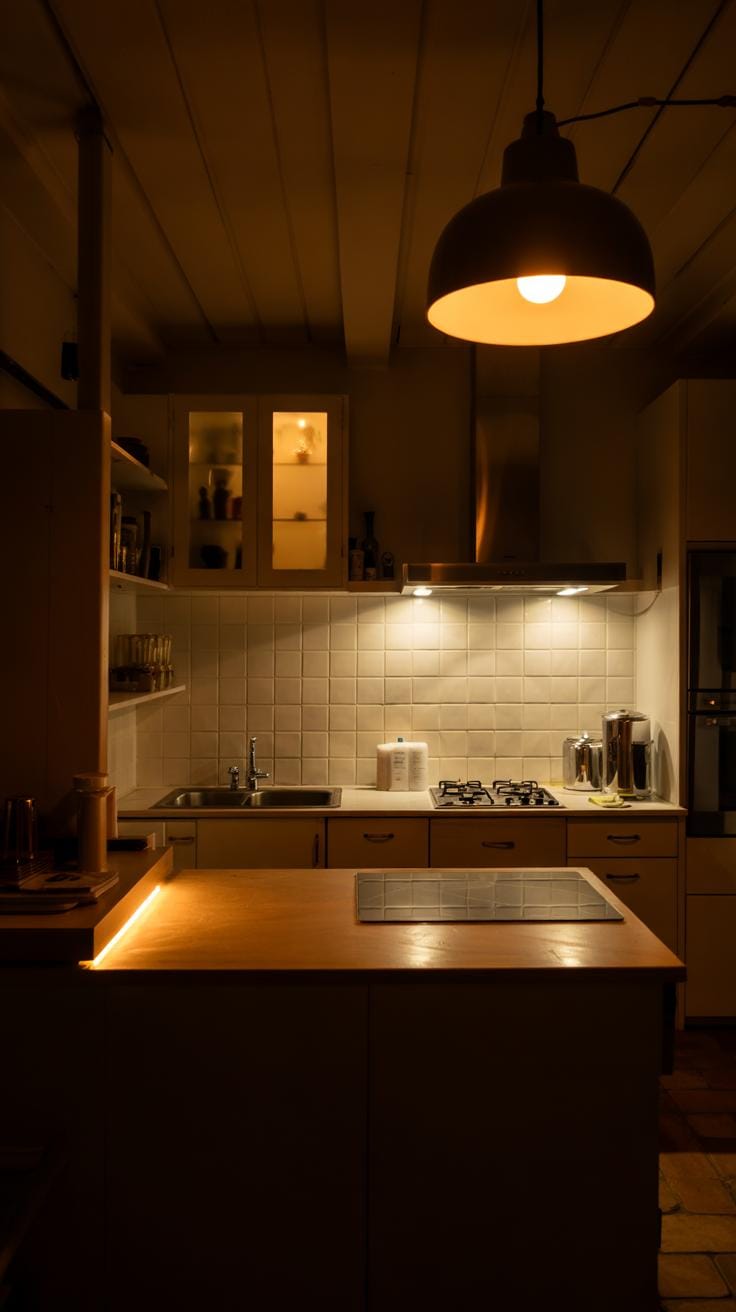 Use natural light as your main source whenever possible. It opens the room and emphasizes simplicity. Position work areas near windows to improve both comfort and efficiency. When natural light fades, add layered lighting that improves visibility but stays subtle. Small LED spotlights or strip lights under cabinets provide excellent task lighting.