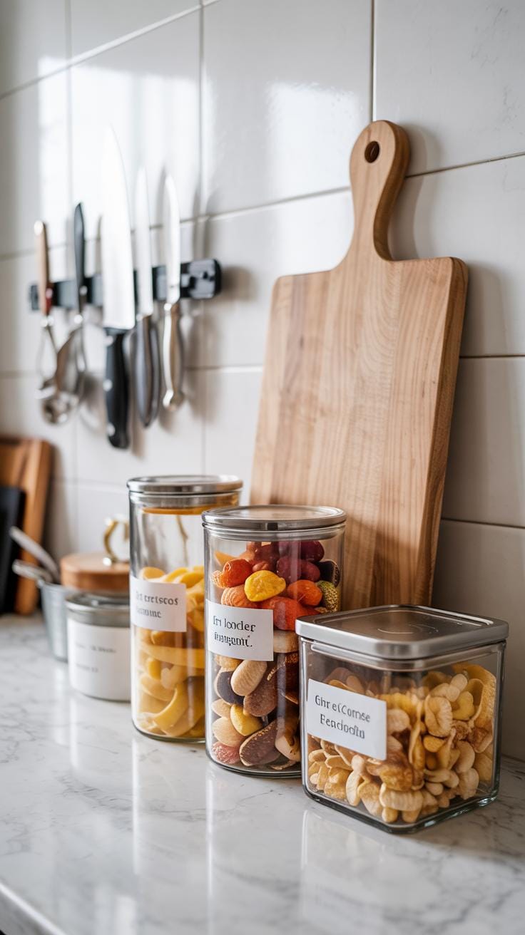 Use clear containers or labeled baskets to keep pantry goods visible and tidy. A well-organized kitchen helps you spot expired products and avoids buying duplicates.