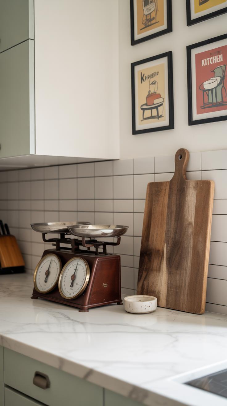 Choosing vintage pieces wisely matters a lot. Look for items with clean lines or subtle detailing that won’t clash with your kitchen’s modern aspects. For example: