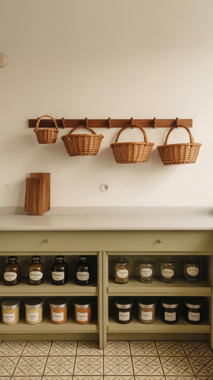 Using baskets on the floor or inside cabinets is practical, but placing smaller containers or jars on open shelves adds visual interest too. Mixing sizes avoids a rigid look and helps you separate everything without making the space feel boxed in. It’s a bit like controlled chaos—organized, yes, but with room to breathe.