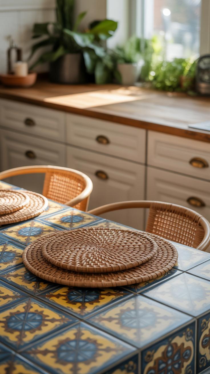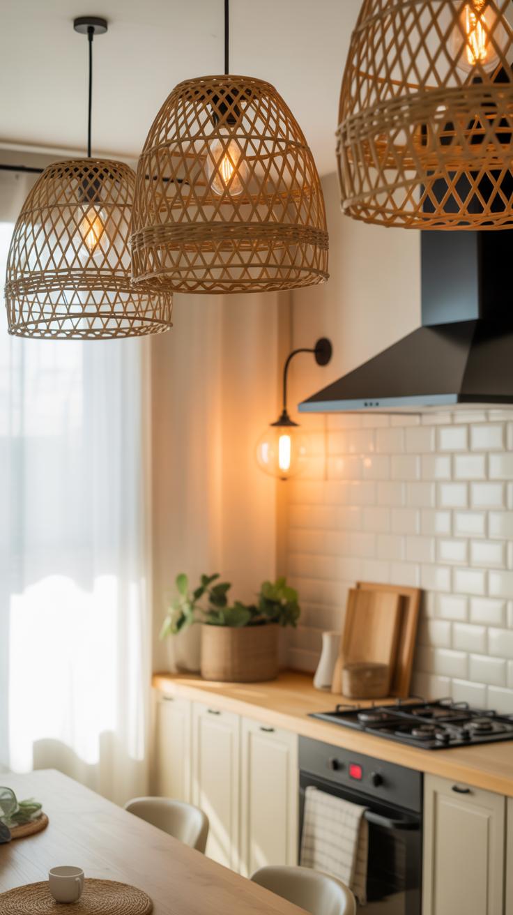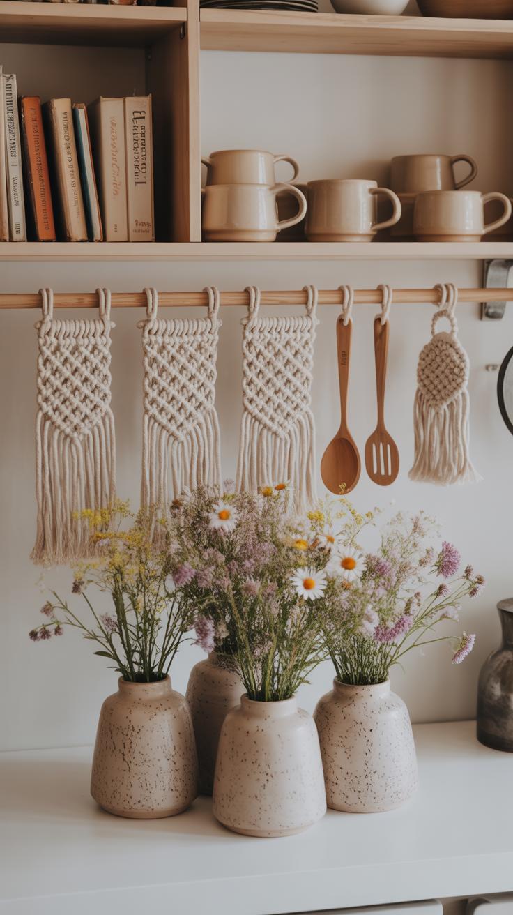 Textiles may seem less obvious in a kitchen, but woven elements can soften the harder surfaces. A woven rug under the dining table, linen curtains, or even macramé plant hangers introduce softness without clutter. These items bring rhythm and texture to the space. They might seem like small touches, but they pull the whole look together in a way that feels both modern and earthy.