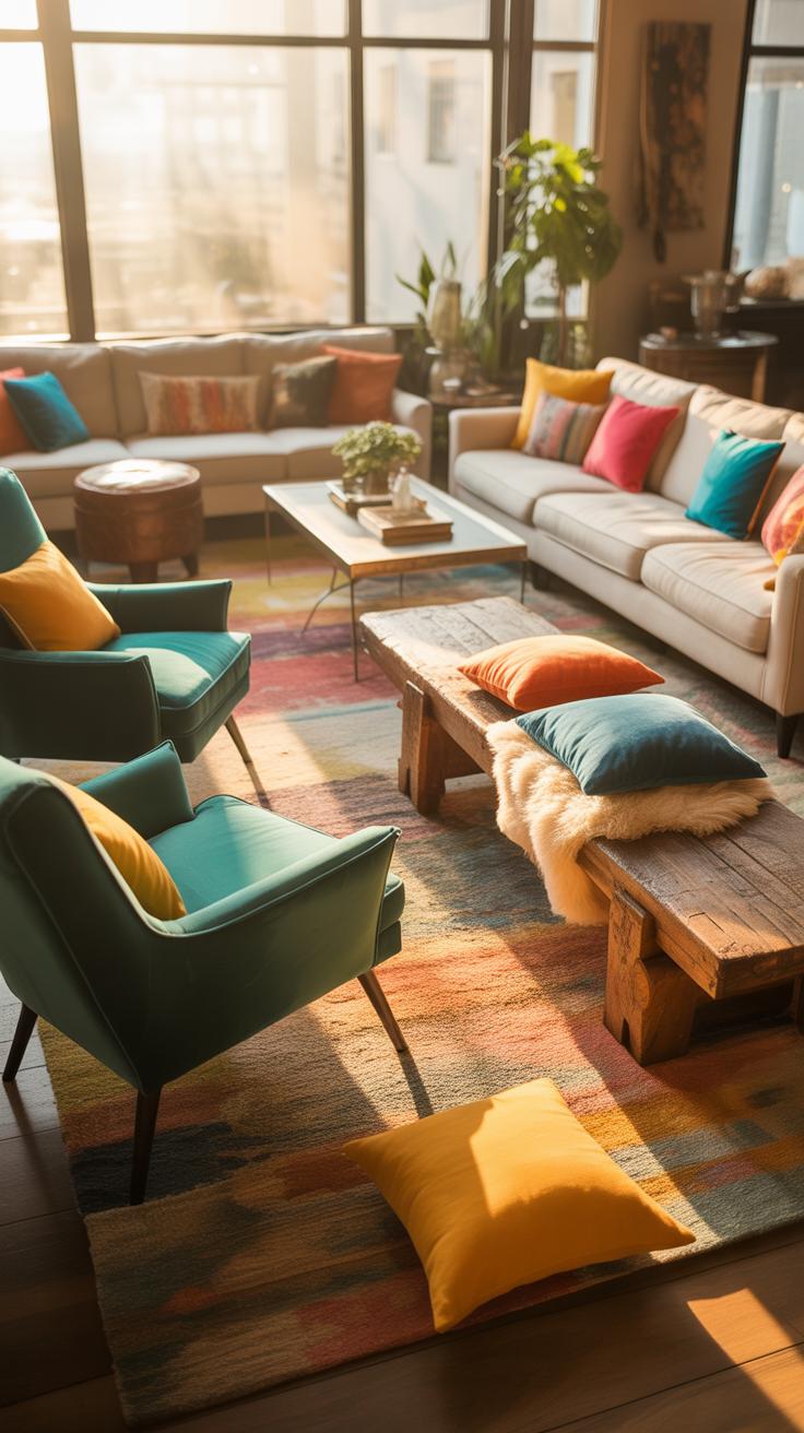 Variety in seating not only adds visual interest but also offers guests options in comfort and style. Combining upholstered sofas with farmhouse-style benches and individual chairs can make your living room feel less like a showroom and more like a lived-in home.