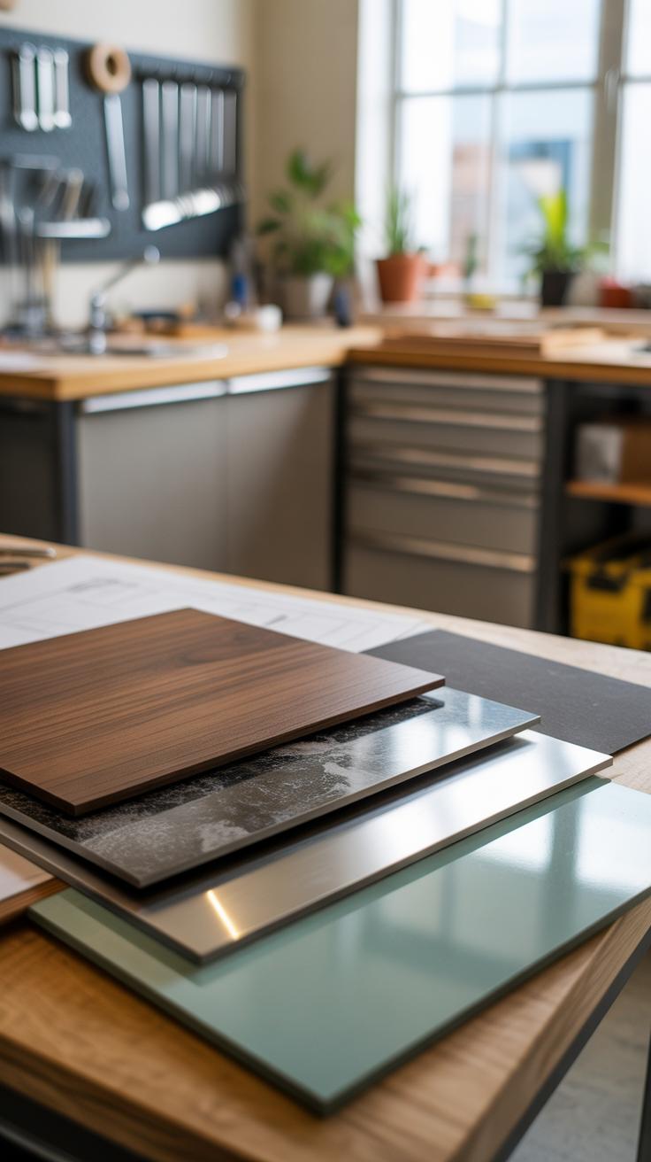 • Materials like wood, metal, or engineered boards emphasizing clean textures