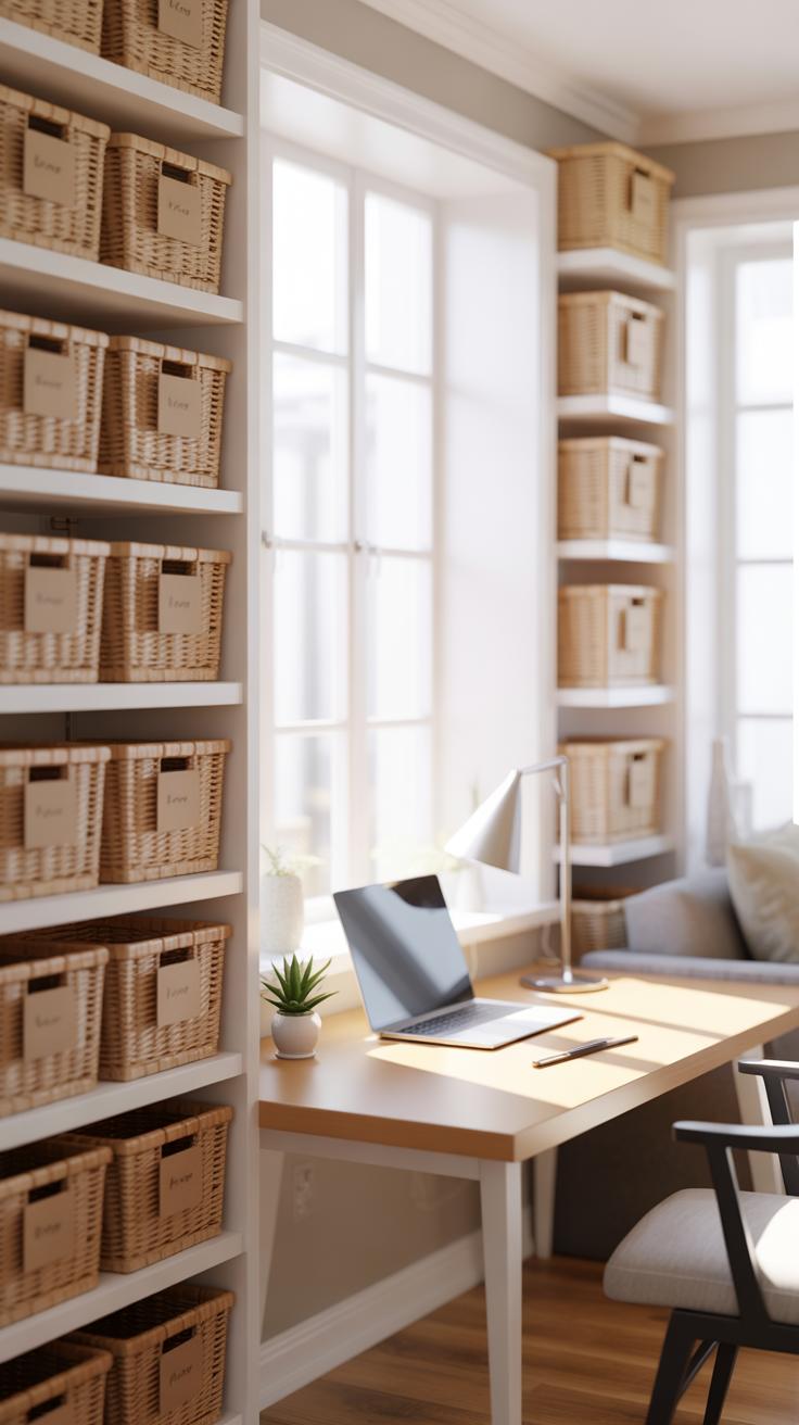 Look for pieces with simple lines and neutral colors. Storage should disappear visually rather than add to the visual weight of the room. Sometimes even a basket tucked under a console or next to the sofa can work if it matches the overall color palette.