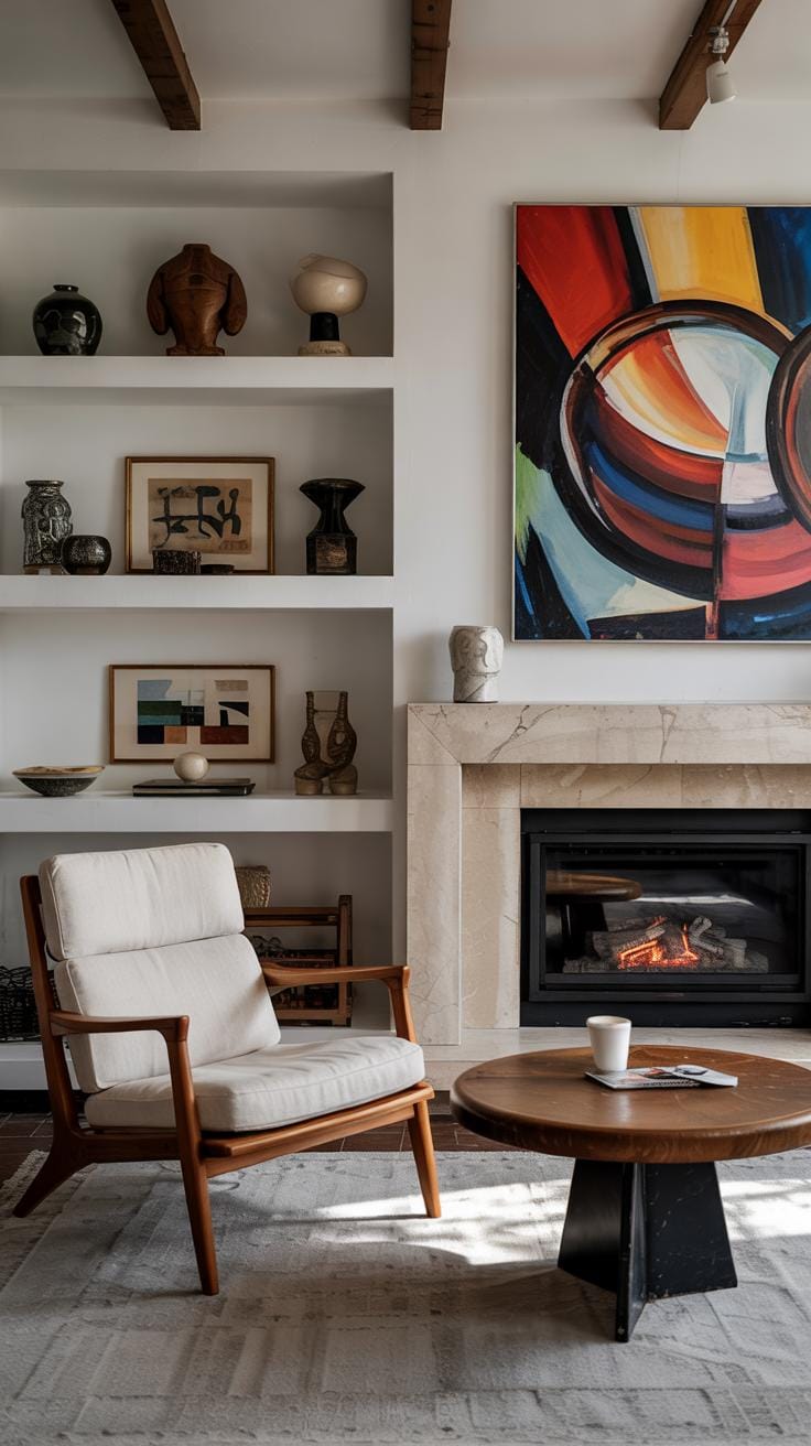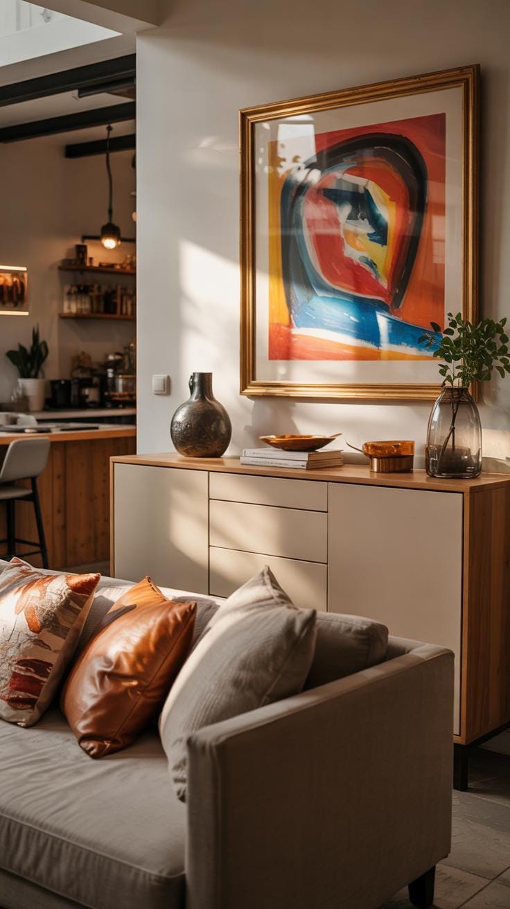 Accessories give you the chance to echo your art’s themes in smaller details. Look for bowls, sculptures, or ceramics that incorporate shapes or colors found in your artwork. For example, a ceramic piece with soft curves can complement a painting featuring rounded forms.