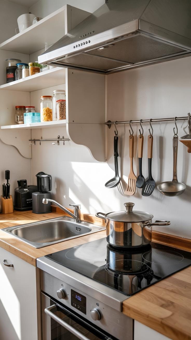 Use vertical space with hanging rails for utensils or spices. Magnetic strips can hold knives safely while saving drawer space. Drawer dividers keep tools neat and prevent overcrowding. Open shelves work if you select items carefully and keep everything tidy.