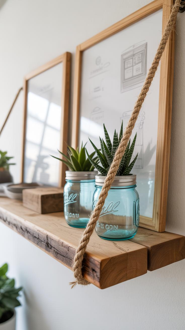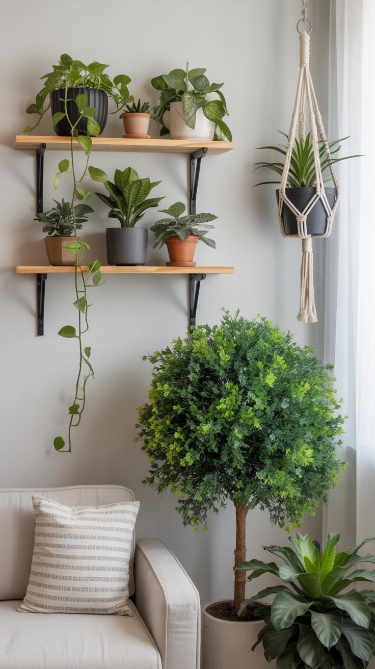 Try suspending hanging plants at varied heights around your shelves. This doesn’t just add visual layers, but also a sense of movement. I’ve noticed that the way light catches leaves hanging near shelves creates subtle shadows, which can make your greenery pop even more.