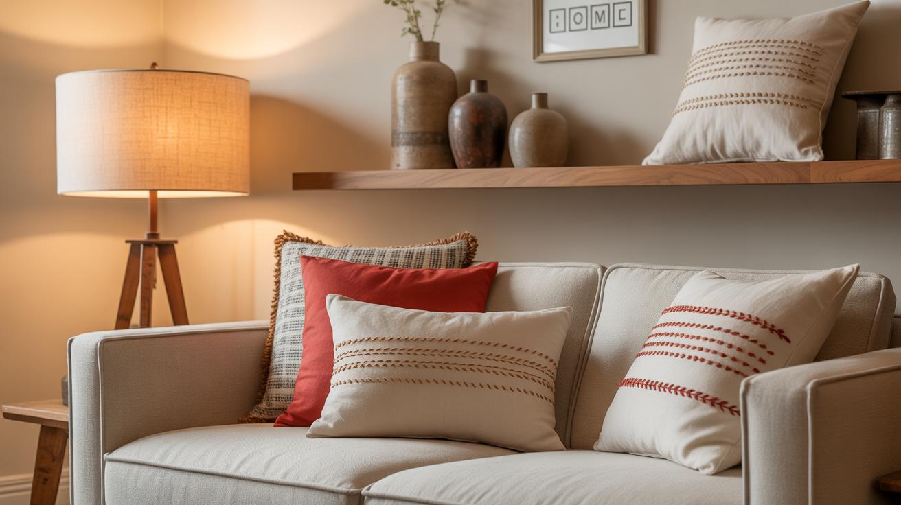 - A white sofa with red accent pillows can feel fresh but not jarring.