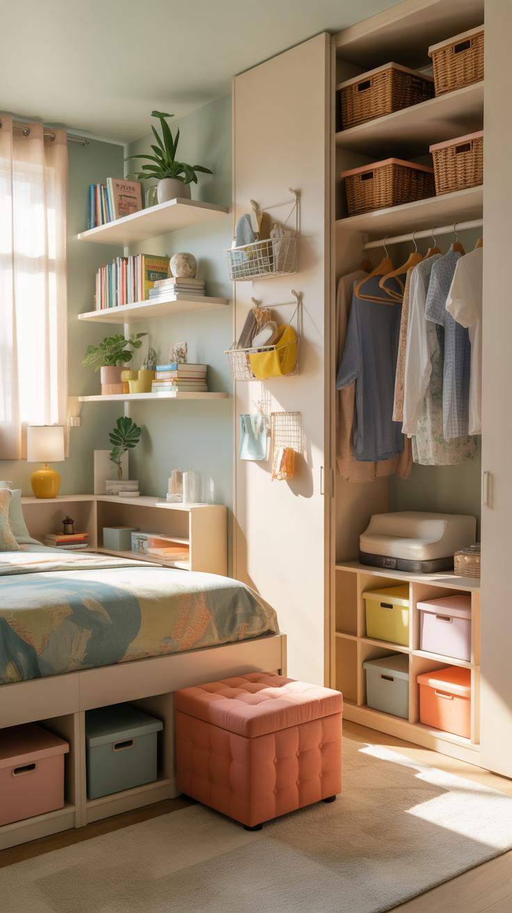 Sometimes it’s about being creative with what’s already there. Have you tried hanging a pegboard on a free wall? It’s surprisingly flexible for storing jewelry, hats, or scarves. And if you’re feeling a bit adventurous, a ladder shelf can hold baskets or folded clothes and still look neat.