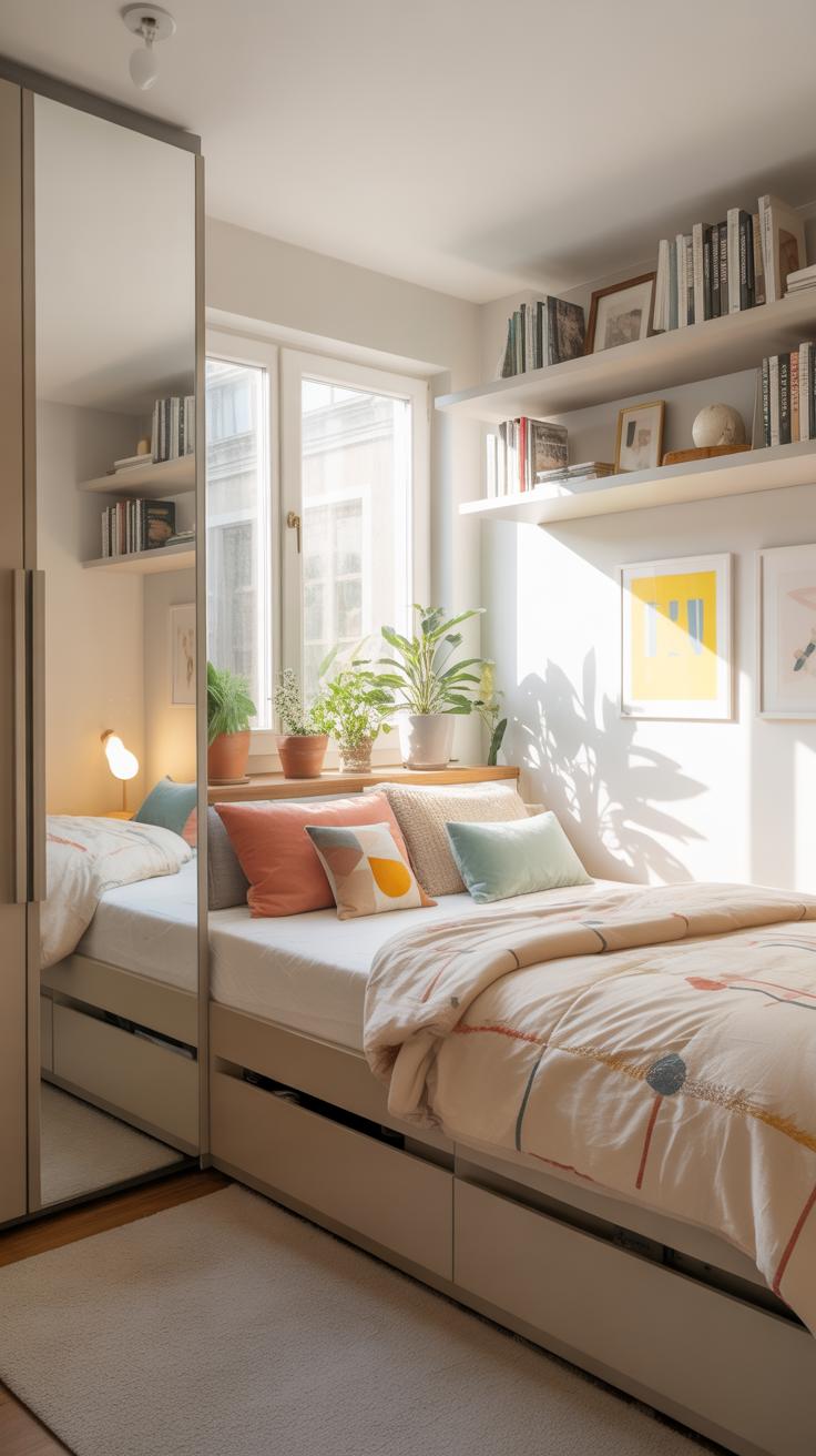 Mirrors create a neat trick on the eye that can make a small bedroom appear more spacious than it really is. It’s about reflection, of course — they bounce light around, doubling what you see, and sometimes even more. When you look into a mirror, your brain interprets the reflected space as an extension of the room. This can confuse your depth perception, leading to a sense of extra room.